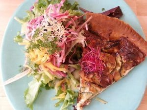 - Prenez la formule déjeuner : ce jour-là, salade de chou rouge, tarte chèvre-amandes et sa salade composée.
