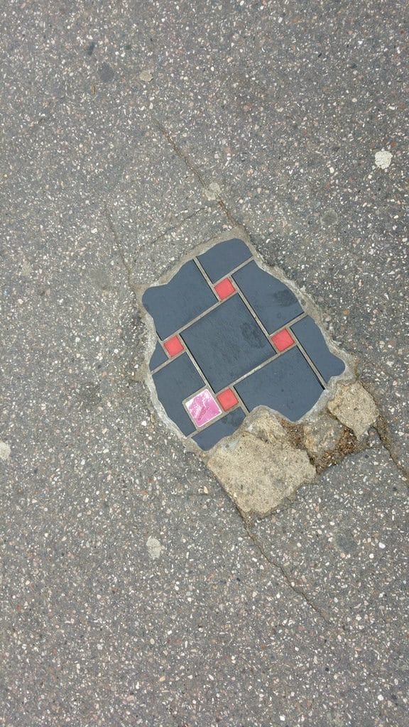 De Turin à Lyon, en passant par Madrid et Dole, l’artiste répare les défauts du bitume : fissures, nids de poule, trous divers… Avec ses flaques, comprenez carrelage de couleurs, Ememem est un vrai raccommodeur-artiste. Non seulement il rafistole la rue, mais il apporte surtout une touche de fantaisie dans la ville.