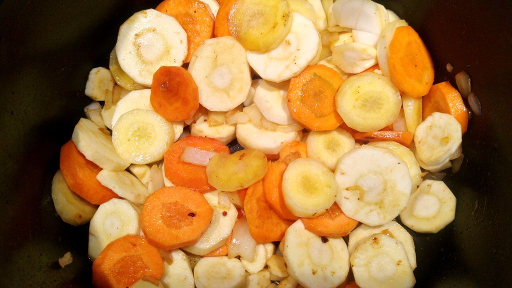Dans la même casserole, faites revenir l’oignon, les carottes et les panais. Puis ajoutez le poulet et saupoudrez de Maïzena. Couvrez.