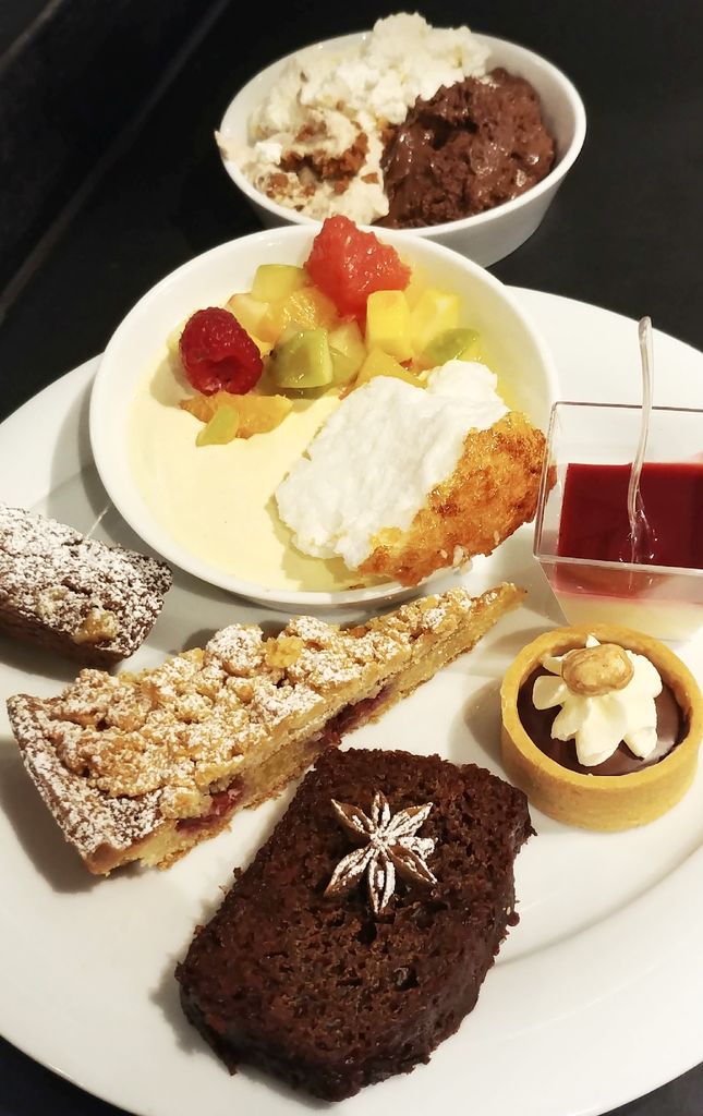 Mais aussi des assiettes chaudes : côte de boeuf cuite sous vos yeux, noix de veau en sauce, saucisses grillées, espadon à la demande, poisson du jour en sauce, différentes sortes de pizzas etc. Pour accompagner, je vous recommande le délicieux gratin dauphinois fondant et crémeux à souhait ! Des variantes existent selon la saison : je me souviens encore des minis courges farcies ou encore du très bon wok de légumes.