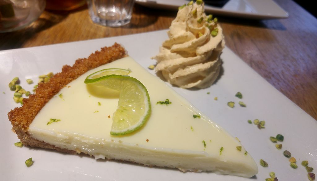 S’il vous reste de la place, et je vous conseille d’en garder, la carte des desserts respire les USA. Perso, j’ai succombé à la Key lime pie (6 €). Cette tarte au citron vert repose sur une base de biscuit au beurre émietté, et est servie avec une bonne crème Chantilly au caramel et des éclats de pistache.