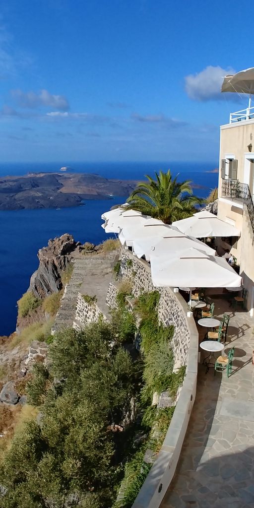Avant 10h le matin, les rues de Fira sont vides. Les magasins commencent à peine à ouvrir. Le moment idéal pour entamer une belle balade au bord de la falaise. Au programme : de belles portes ouvrant sur la mer, les façades blanches mises en valeur par de beaux vases, des fleurs aux couleurs vives ou encore de chouettes mobiliers de jardin.