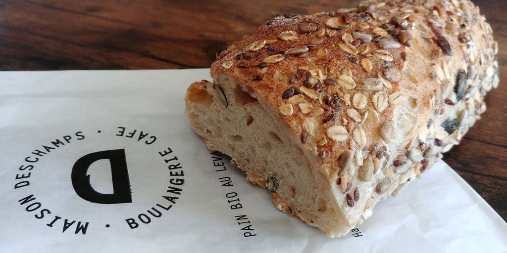 Si la maison Deschamps ne propose pas de baguette traditionnelle, c’est pour se concentrer sur une belle gamme de pains bio vendus au poids et des pains sans gluten. Comme le pain libanais à la farine de riz et petits morceaux de pois chiche, recouvert de graines de pavot. Avec un peu de beurre, c’est un bonheur ! Les amateurs de graines seront quant à eux ravis de croquer dans la Belle des champs, une sorte de grande baguette aux graines de courge et tournesol. Profitez-en pour effeuiller leur très bon croissant ou pour croquer dans leur flan soyeux (quoi qu’un un poil cher par rapport à d’autres flans plus savoureux dans le quartier).