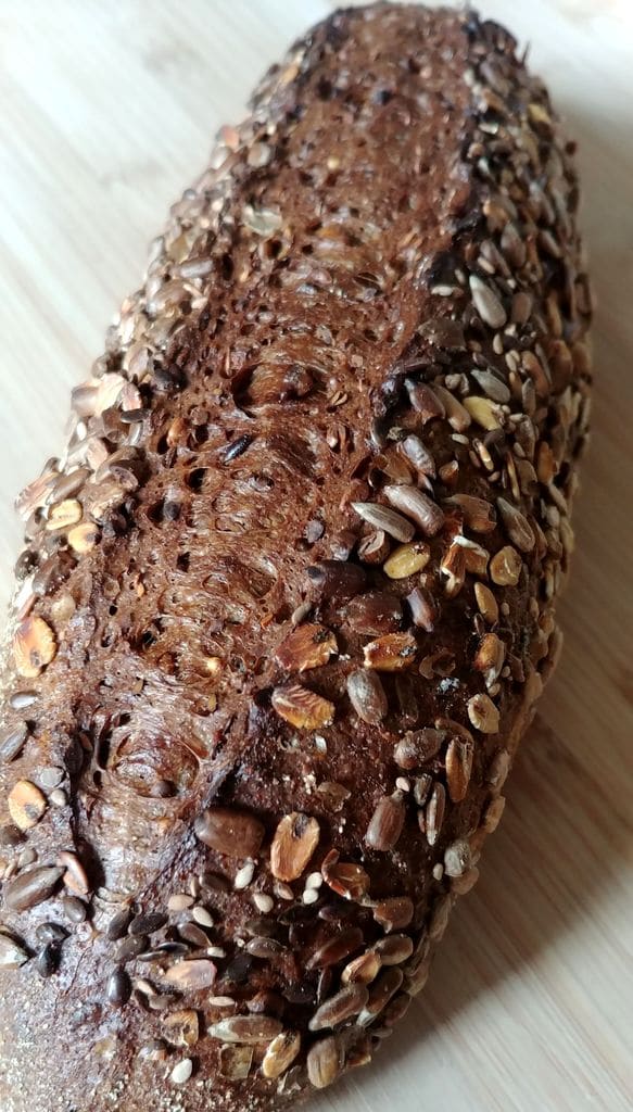De son côté, le Sechskornbrot, aussi appelé pain nordique, est un pain ultra riche en graines. 6 sortes en l’occurrence (courge, lin, tournesol, pavot, flocons d’avoine et sarrasin). Il est réalisé avec de la farine de blé bio semi-complète pour moitié et farine bio intégrale de seigle pour l’autre moitié. La croûte est super croustillante et la mie très moelleuse et nourrissante. Autre bon point, il se conserve aussi très bien !