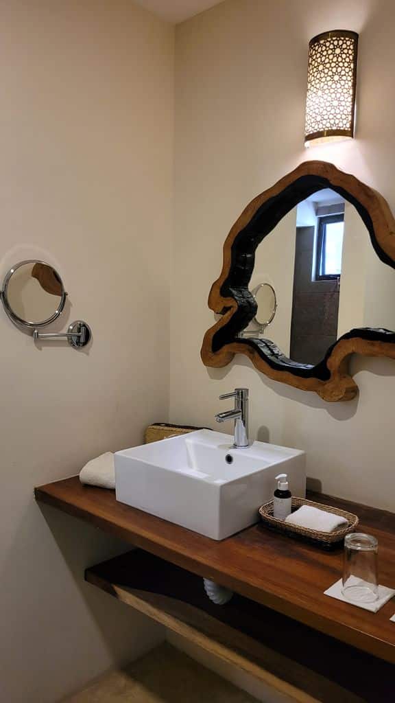 Et c’est au Naala Tulum que nous avons passé 2 nuits. Un hôtel 4 étoiles situé entre le centre et les plages. Ici notre chambre 103 (Deluxe King avec balcon), qui s’ouvre avec un bracelet connecté, était très bien. Grande literie confortable, déco tendance, large salle de bains (coup de cœur pour le miroir) et balcon donnant sur un jardin intérieur. Avec sa cascade et ses espaces ombragés, ce joli jardin invite à la détente.