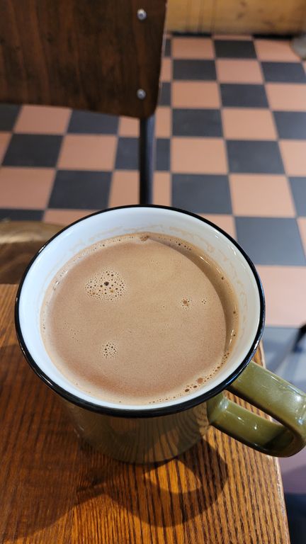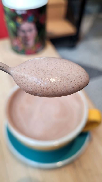 Il n’y a pas que dans les chocolateries ou coffee shops qu’on trouve du bon chocolat chaud. Chez Gomex cantina, après avoir dégusté un super tacos, le chocolat chaud à la mexicaine est incroyable (4,90 €) ! Il est réalisé minute avec de la poudre de cacao du Mexique et des épices (cannelle, cardamome, clou de girofle, piment doux…). Ca donne un chocolat chaud mousseux et très parfumé, selon le même principe qu’un chai latte : le lait adoucit les épices tout en donnant un ensemble gourmand !