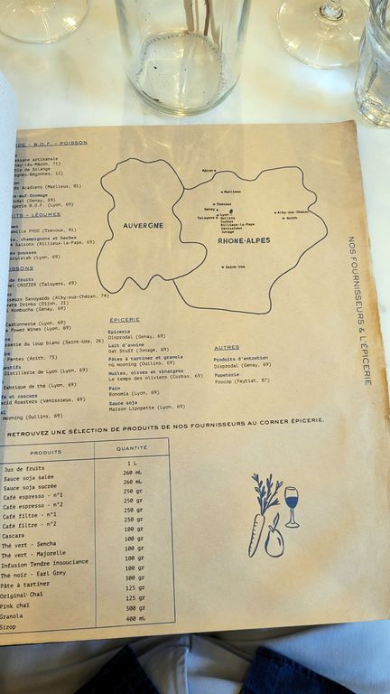 Et c’est un vendredi soir qu’on est venu tester la carte. Le chef la renouvèle chaque semaine, en la travaillant avec des produits frais et ultra locaux. Ses légumes viennent de Trévoux, ses pousses végétales du Minusculelab du coin de la rue, son pain de la boulangerie Bonomia dans les pentes de la Croix-Rousse… Même l’origine ultra locale des sauces et des produits d’entretien est clairement affichée sur le menu. Transparence totale !