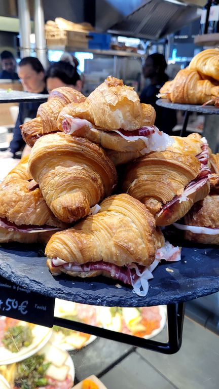 Pintxos basques par ici, planches apéro par là, huîtres au fond de la halle, cuisine réunionnaise et traiteur asiatique dans une allée, antipasti italiens à l’entrée… Le plus dur c’est de choisir parmi les 23 étals. Et de trouver une place à l’heure du rush aussi. Mais heureusement, il y a de nombreuses tables à l’extérieur. Et donc j’ai jeté mon dévolu sur un formidable roll sandwich au poisson chez Les requins marteaux (12 €) ! Pour le dessert, faites un saut à la P’tite boulangerie.