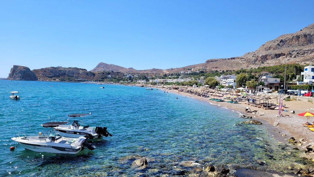 Une plage à Rhodes avec vue historique ? Au sud-est de l’île, Lindos beach est un sympathique spot pour se baigner tout en profitant de la vue sur l’acropole. Cette plage est aménagée avec tous les services, idéale pour se relaxer après une (chaude) balade dans les rues de Lindos. Et pour une superbe vue en hauteur sur cette plage à l’eau turquoise, je vous conseille un café glacé au Rainbird.